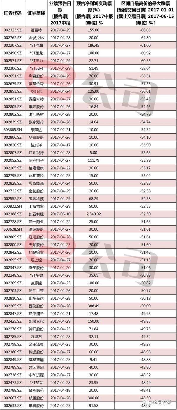 数据同时显示,今年以来跌幅最深且中报业绩大幅预增的前五十大股票为: