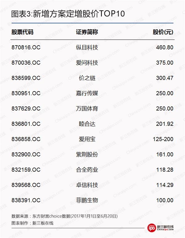 另一方面,即便在这样清淡的市场氛围下,新三板挂牌企业定增价也居高不下。据新三板在线了解,2017年以来新公布的定增方案中,发行股价超过100元的方案达13家,纵目科技在5月23日更以460.8元/股的定增价高居榜首。截至目前,纵目科技、嘉行传媒等11家挂牌公司已经完成其百元发行价的相关定增计划。