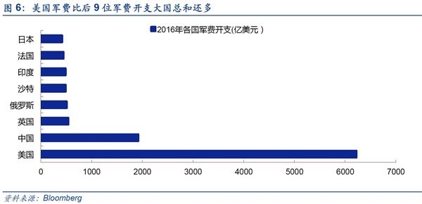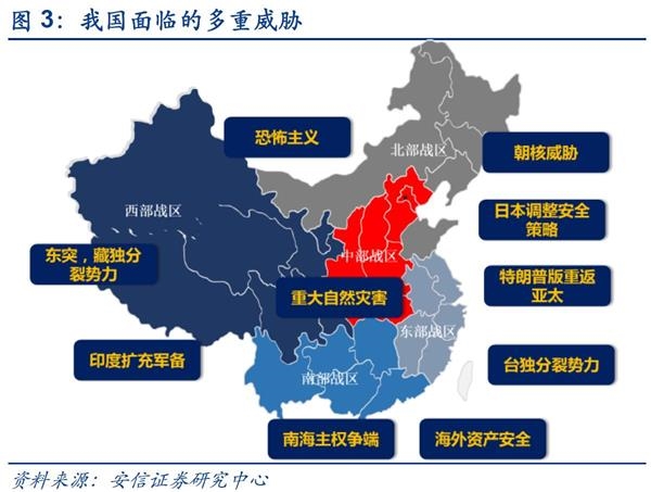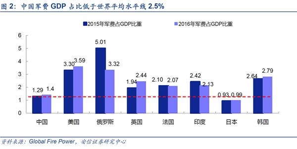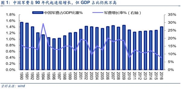由于我国军工产业起步晚,军事投资占GDP比重不高。中国整体军事实力在数量和质量上仍有较大的差距。在数量上,中国现役三代战机数量和先进舰艇数量与美国有较大的差距,相对于我国辽阔的国土仍然捉襟见肘。在质量上,中国虽然在某些技术领域达到国际先进水平,但是在传统领域如精密工业,材料等领域与发达国家有较大的代差,这是工业积累时间尚短所致,是每个国家都必经的历程。与此同时我国面临多重威胁,风险敞口逐步扩大:东突藏独等恐怖分裂势力蠢蠢欲动,朝鲜核问题迟而不决,美国萨德入韩,南海问题等都是切切实实的威胁,不利于中国经济稳定增长的大局。