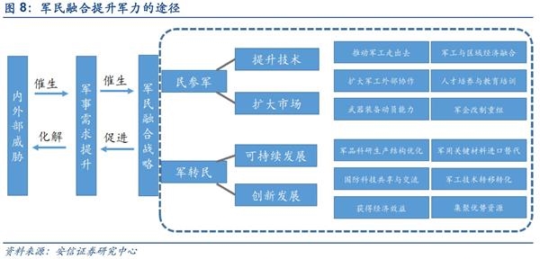 ■军民融合是大势所趋:20余年的和平发展让中国成为世界经济第二大强国,但在军事发展的脚步却稍显落后。当前,复杂的国际形势和中国未来的大国崛起之路更加需要强劲的军事实力保驾护航,但目前我国军事发展面临的是外延式提升面临预算约束和内涵式发展动力不足两大掣肘。如果能解决这两方面的问题,中国军事实力就能获得巨大提升。军民融合正是在此背景下应运而生,于2015年正式上升为国家战略。