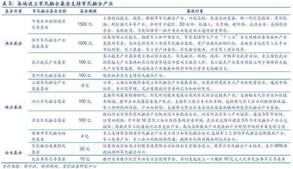 军民融合支持基金发展迅速,产业支持落在实处:2016年下半年至今,各地军民融合产业支持资金如雨后春笋建立。基金主要用来支持军工企业军事技术转移转化,促进军工资产证券化,军民融合企业产业投资等。目前这些基金均处于成立阶段,预计2017年会有较为亮眼的表现。