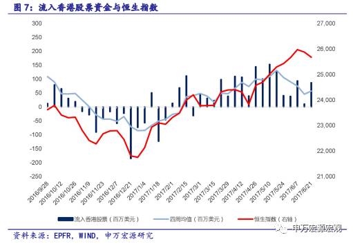 在MSCI宣布结果之前资金呈现大幅流入状态。根据EPFR的数据,从3月23日A股申请加入MSCI指数开始,中国股市基本一直呈现资金流入状态,到6月21日,中国股市资金总共流入44.05亿美元。2017年上半年中国股票市场一共净流入50.49亿美元净资产,新兴市场资金净流入388.10亿美元,香港股市资金净流入12.75亿美元。