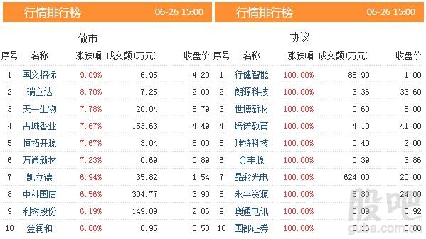 从新三板股票的市场表现来看,今天有10只股票涨幅超过100%,共有54只个股涨幅超过30%。