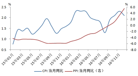 数据显示,2016年12月CPI同比上涨2.1%,连续三个月处于“2时代”,全年CPI同比上涨2.0%。12月PPI同比上涨5.5%,预期4.6%,前值3.3%。
