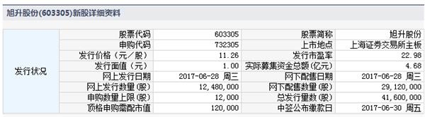 根据交易所公告,宁波旭升汽车技术股份有限公司于2017年6月28日进行网上和网下申购。本次发行股份数量为4,160万股,全部为新股。回拨机制启动前,网下初始发行数量为2,912万股,占本次发行总量的70%;网上初始发行数量为1,248万股,占本次发行总量的30%。