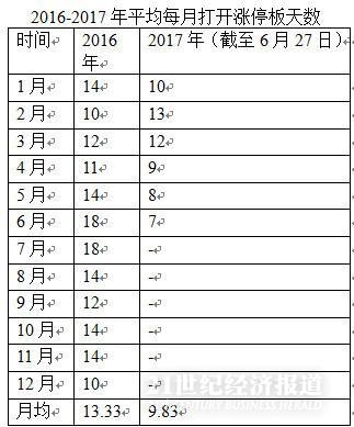 而随着新股的大量推进,其稀缺性在降低,赚钱效应也正在减弱。我们以打开涨停板天数作为参考指标,根据21世纪经济报道记者统计,截至6月27日,2017年上半年每只新股打开一字涨停的平均天数为9.83天,与2016年的平均数13.33天相比,减少了近4个涨停板。