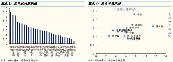 从上周涨跌幅来看,周期板块开始领涨,煤炭、建材、有色、钢铁等板块涨幅均超过2%,相关期货价格上涨是重要的原因。除了周期之外,餐饮旅游受益于旺季预期,也表现较强。家电、非银和传媒表现最弱。从风格来看,上周表现最强的是中盘股,高估值的成长股和低估值的绩优股均表现一般。