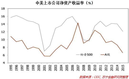 第一,我国投资回报率持续下降是新常态资产荒的主要表现形式。毋庸置疑,实体经济依然是优质资产的主要来源,而实体经济是否蕴藏丰富的优质资产,主要取决于企业部门的投资回报率。近年来,中国企业部门的投资回报率出现大幅下降,既有经济周期性原因,也有企业税负高企、劳动力和能源等要素成本上升等中长期结构性因素。从中美上市公司的净资产收益率变化来看,2011年以来我国A股上市公司净资产收益率从12.3%持续下降至2015年6.2%左右,接近腰斩。与此同时,标准普尔500上市公司净资产收益率虽然也经历了下降,但始终保持在12%以上,显著高于历史平均水平(参见下图)。由此,我国实体经济投资回报率短期内回升的可能性不大,这将加剧实体经济的资产荒压力。