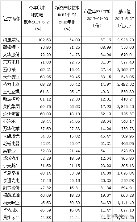 “漂亮50”的选股标准不一,海通证券(600837)近期策略研报表示,其主要通过三大指标构建了漂亮 50 个股组合。这三个标准分别是:①今年以来涨幅 20%以上(截止6月底);②目前总市值在 300亿以上(以行业龙头为主);③2016年ROE在15%以上。(见附表1)