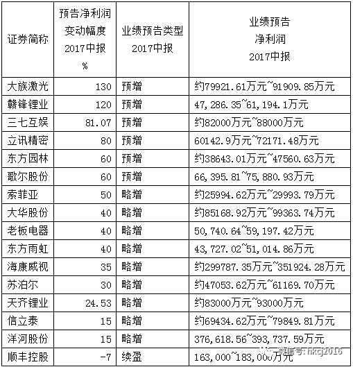 净利润同比增长最高的则是大族激光(002008),预计2017年中报净利润约79921.61万元~91909.85万元,同比增长100%~130%,大族激光表示,2017年上半年消费类电子、新能源、大功率及PCB设备需求旺盛,公司产品订单较上年同期大幅增长,公司2017年2季度经营业绩好于预期。