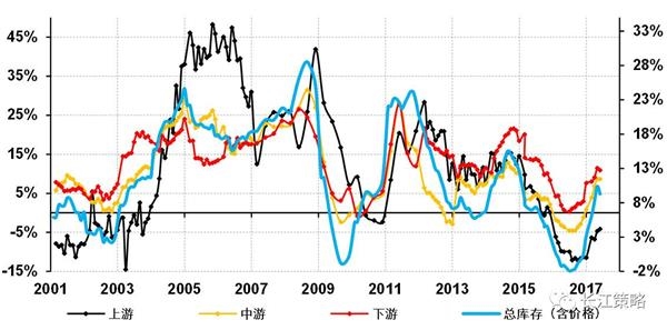 这一轮补库,在需求因素上弱于前一轮(2010-2013年),但在供给因素上又好于上一轮(2013-2016),补库的路径可能介于两者之间,主观认为更类似于缓和版的14年补库。在库存绝对水平较低+过剩产能行业厂商补库仍较谨慎背景下,三季度库存逐步筑顶,但下行幅度将会更为温和,对盈利的冲击有,但相较15年上半年更为缓和(2.6%降至-8.8%).