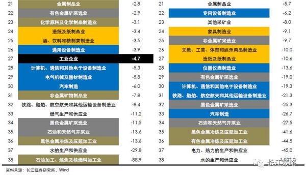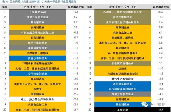上一轮(14年补库)库存拐点(2014年8月)后一个季度,盈利端的行业比较排序:上游部分采掘>消费制造(可选>必需)>设备制造(工业>消费)>加工冶炼(石油化工>基本原材料);