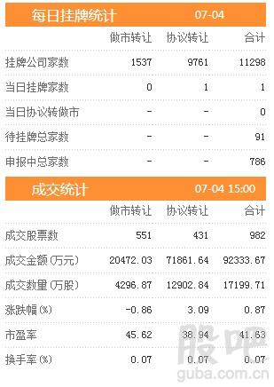 昨日新增挂牌企业1家,挂牌企业总数达到11298家,做市转让1537家,协议转让9761家,待挂牌总家数91只,申报中总家数达到786家。