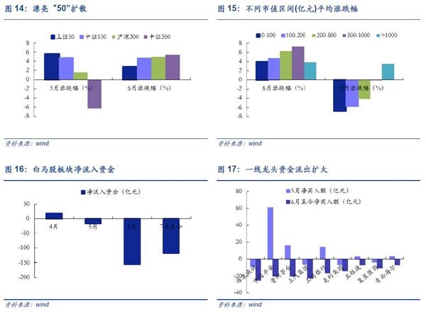 值得注意的是6月出现一线龙头向二线品种扩散的现象,我们不太看好扩散的持续性。年初以来以上证50为代表的一线龙头走出结构性牛市,年初至今涨幅高达46.72%,以家电和白酒为代表的消费白马更是成为资金追捧的主要对象。自6月下旬以来,白马股明显回落引发市场对白马行情持续性的探讨。具体而言,从涨跌幅上看,6月上证50、中证100、沪深300、中证500涨幅分别为2.86%、4.73%、4.98%和5.39%,中证100、沪深300创年初以来新高(5月份对应涨跌幅为5.63%、4.81%、1.54%和-6.24%),相较于5月份“漂亮50”行情正向二线品种扩散;同时,5月高市值公司(>1000亿元)涨幅最高, 6月中高市值(500-1000亿元)涨幅最高,高市值(>1000亿元)涨幅最低,行情从高市值向中高市值传递。另外,从资金流向来看,前期资金持续流入白马股板块,6月以来资金净流出额高达271.93亿元,7月至今资金净流出117.64亿元。结合个股来看,一线龙头中国平安、贵州茅台、五粮液等纷纷由5月资金净流入转为资金净流出,海康威视、上汽集团、美的集团、复星医药等资金净流出金额扩大。对于一线龙头向二线品种扩散的现象,在当前环境下我们不太看好扩散的持续性。具体而言,当前所谓的扩散只是“次品补涨”,其基础不是市场环境显著改善,而是市场对一线白马龙头的估值信心不足,不愿意跟随,扩散并不具有持续性.