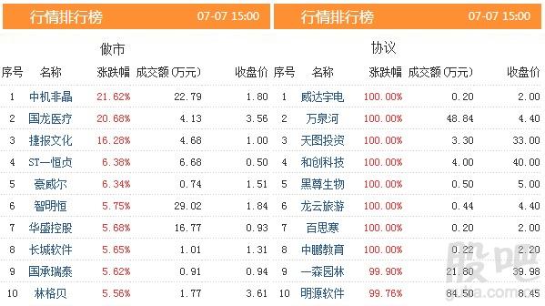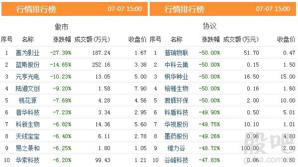 7日共有915只股票发生交易,成交金额9.71亿元,做市转让成交4.13亿元,协议转让成交5.58亿元,成交数量19757.08万股。