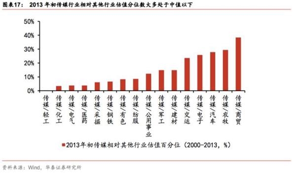 以传媒板块为例,2013年初其相对其他行业的估值处于合理区间:2013年初传媒板块相对轻工、医药、钢铁、有色、军工、建材、商贸等行业的相对PE百分位均在历史中值以下,估值相对其他行业较低。