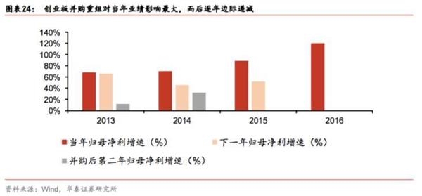 从对盈利的影响方面来看,首先,并购重组对业绩的正向影响呈边际减弱效应。2013年以来创业板的并购重组对当年业绩影响最大,但影响呈边际递减。以2014年为例,创业板完成并购重组35件,14年归母净利增速高达70.33%,15年则降低为45.76%,16年继续下降至32.06%。