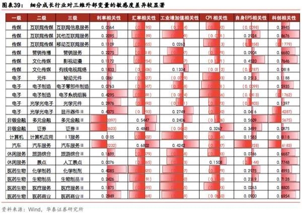 传媒、电子、医药生物一级行业下具有多种细分成长性子行业,对三维外部变量,存在较明显的结构性差异。传媒成长子行业中营销服务利率敏感度最低,而互联网信息服务利率敏感度相比其他子行业要高;影视动漫盈利敏感度相对较高,移动互联网服务盈利敏感度则偏低;其他互联网服务、影视动漫、营销传播与科创周期相关性更高。