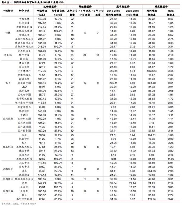 在不同的外部宏观环境下,市场资金追求不同的溢价:成长性溢价、流动性溢价、确定性溢价、稀缺性溢价等等,不同的溢价受行业的A股市场特征影响:大市值公司的占比、市值均值、潜在限售股解禁量等带来细分成长行业的流动性溢价差异;行业内上市公司总数量及IPO速度、行业龙头是否在A股上市等带来细分成长行业的稀缺性溢价差异;行业内上市公司盈利平均情况带来细分成长行业的成长性溢价差异;行业内上市公司盈利的历史波动率和内部标准差带来细分成长行业的确定性溢价差异。