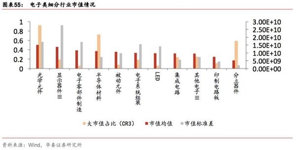 电子:光学元件、的流动性溢价相对较低。市值均值角度,细分行业中市值均值最大的是光学元件,其次显示器件和电子零部件制造。市值集中度角度,除去只有5家和5家以下上市公司的三个细分行业,其他电子和集中电路行业集中度较高,LED和电子零部件制造细分行业集中度较低。市值标准差角度,显示器件的市值标准差较大,而分立器件市值标准差较小。三个特征结合看,上市公司数量较多的显示器件行业具有市值均值大、行业集中度不高且不同上市公司规模差异也大;上市公司数量较多的集成电路行业具有市值均值比较小、行业集中度比较高且不同上市公司规模差异比较小的特点;而偏消费电子领域的细分行业:电力零部件制造行业市值均值较大,行业集中度最低,上市公司规模差异比较大。