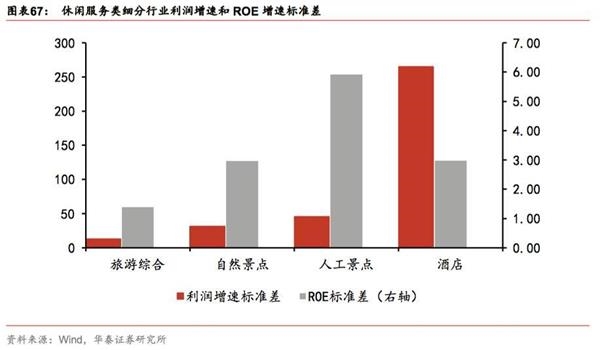 休闲服务:从2010-2016年归母净利增速与ROE标准差看,旅游综合和自然景点两个细分行业波动性最小。