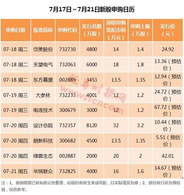 如无变化,本周(7月17日~7月21日)将有9只新股申购,按照数量计,单周可供申购的新股数量创下近期新高。