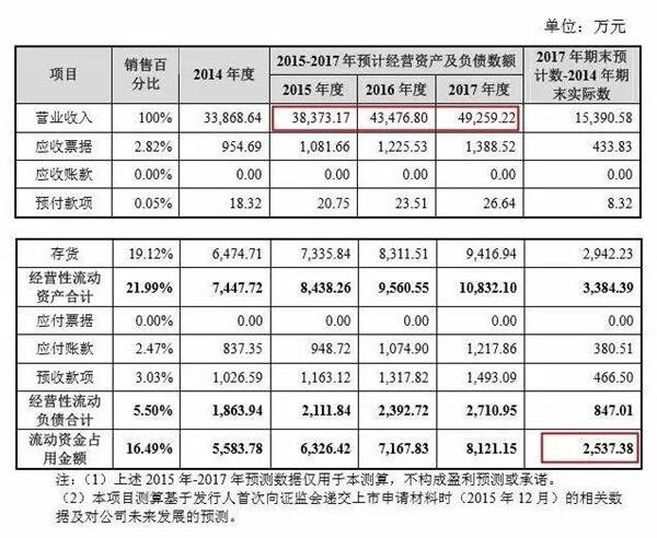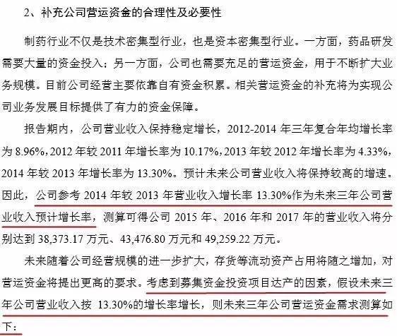 申报稿显示,大理药业补充公司营运资金的合理性及必要性中,预计2015年至2017年营业收入分别为38373.17万元、43476.80万元和49259.22万元。并据此计算得出,需要补充2500万元的营运资金。