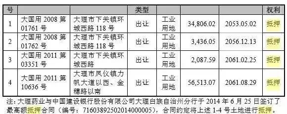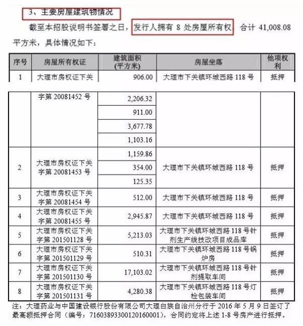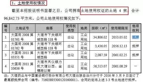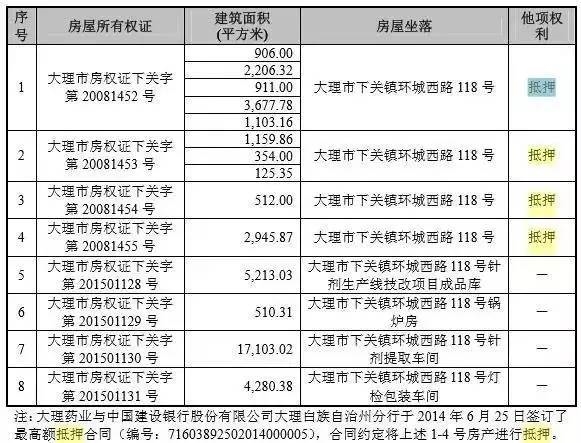 2015年12月15日报送的申报稿显示,大理药业拥有8处房屋所有权,合计41008.08平方米,其中有四处处于抵押状态。大理药业土地使用权证的土地4宗,合计96842.73平方米,全部处于抵押状态。