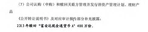 除了约70万元的利息外,南京证券还补充披露了一笔发生在2013年、向富安达出租交易单元席位的193万元佣金,以及一笔400万份的赎回交易——“富安达现金货币A”,看来该笔交易在之前的财务报告中竟然被遗漏了。