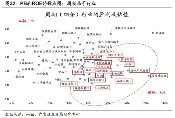 基于申万一、二级行业分类,我们筛选出属于周期品的二级细分行业(一级行业展开成二级行业),并将周期品的估值(PB)和盈利能力(ROE)进行匹配。
