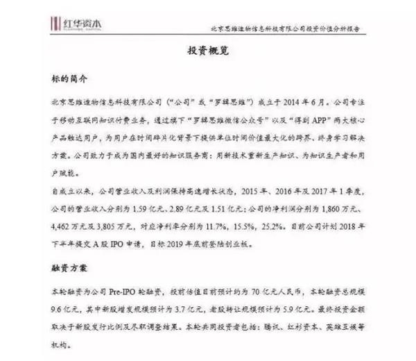 昨天网上盛传一份名为《北京思维造物信息科技有限公司投资价值分析报告》文件的部分页面截图。文件显示,罗辑思维运营方北京思维造物信息科技有限公司(以下简称罗辑思维)计划2018年下半年在A股提交IPO申请,目标2019年底前在创业板上市。对此,罗辑思维创始人罗振宇回应称“还没有时间表”。 罗振宇的具体回应如下: