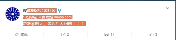 早在7月17日记者曾在微博表示,贾跃亭明天、最迟后天回国。