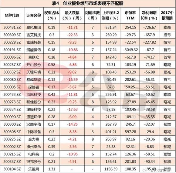 文中列出了在创业板综指中权重占比较高,且2014年至2016年净利润增长率为负的前20家企业(表4)。显然,除易成新能外,其余19家企业自上市至2017年5月2日的股价均有不同程度的上涨,其中有15家企业股价颇高,尤其是乐视网更是独占鳌头,股价涨幅高达1156%。