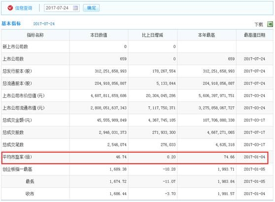 另外,据深交所网站数据显示,目前创业板平均市盈率为46.74倍,较上一个交易日基本持平。不过据记者了解,深交所这一数据为静态市盈率,即以2016年年报每股盈利(EPS)计算得出。计算公式=每股市价/2016年EPS.