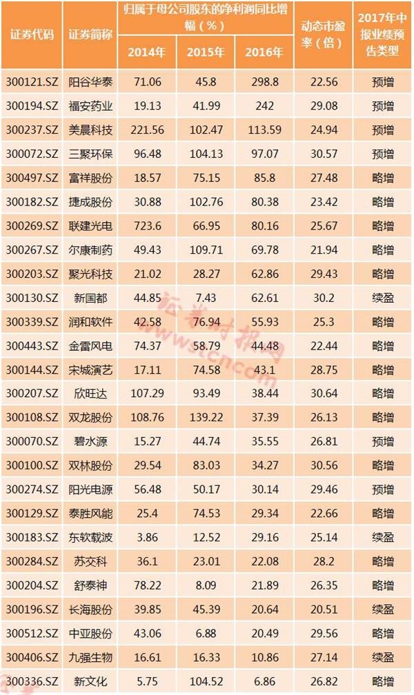 记者统计发现,创业板中有26只个股2014年至2016年归属母公司股东的净利润都呈增长态势,2017年半年报业绩预告类型属于预喜,且最新动态市盈率小于30倍。