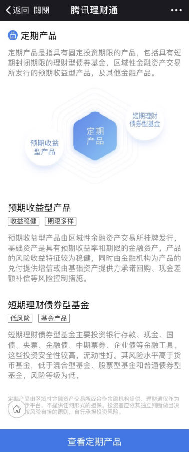 据悉,理财通旗下的定期产品主要包括预期收益型产品和短期理财债券型基金产品两类。其中,预期收益型产品是由区域性金融资产交易所挂牌发行。