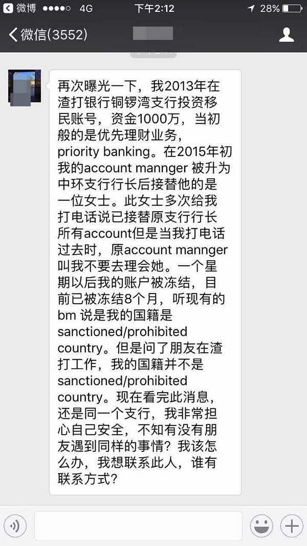有一位王姓投资人士联系到澎湃新闻记者,并随后于1月11日傍晚通过张小姐的微信公号发布了自己的经历,称“想让更多的人了解到在香港开户的风险”。他于2013年中旬因为企业需要通过渣打银行办理投资移民,申请成为圣基茨和尼维斯的公民。2016年5月,王先生收到渣打银行的信,信上称他的资产来源有疑,需要他清除账户,否则账户将会被冻结。他两次发材料解释资产来源以及企业的年审报告,但是最终还是处于冻结状态。渣打给他的答复是“商业决定”,没有其他解释。澎湃新闻就此联系了渣打银行,还未得到回复。