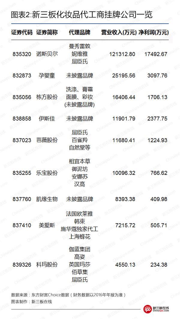 新三板上从事化妆品代工的企业占据了“半壁江山”,共有9家企业。新三板在线梳理出了挂牌企业部分代工的品牌(有部分代工品牌企业未披露).