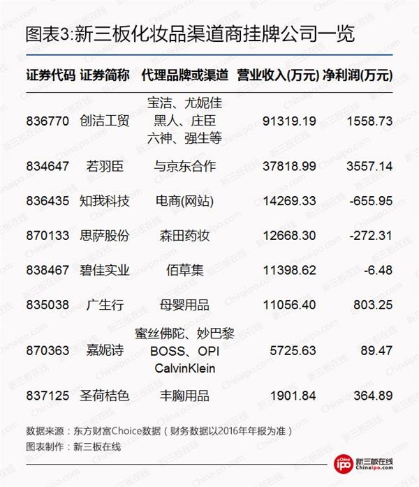 渠道商,就是商品实体和商品所有权从生产向消费转移的整个过程。新三板在线通过梳理,将挂牌企业中的7家化妆品渠道商总结如下: