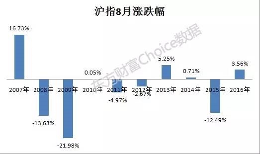 东方财富Choice数据统计显示,从2007年至2016年沪指8月份走势可知,上涨和下跌的次数几乎相等,但是下跌月份通常跌幅较大。