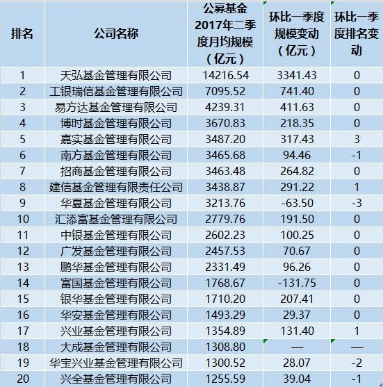 除了排位并未发生变动的前四名,第二季度的月均资管规模超过2000亿元的还有9家基金公司,规模超过3000亿元的分别是嘉实基金、南方基金、招商基金、建信基金、华夏基金,规模在2000亿元到3000亿元之间的分别是汇添富基金、中银基金、广发基金、鹏华基金。