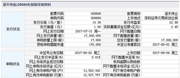 根据交易所消息,浙江春风动力股份有限公司首次公开发行股票网上定价发行有效申购户数14,593,385户,有效申购股数为103,061,418,000股,网上发行初步中签率为0.01293404%,配号总数为103,061,418个,号码范围为100,000,000,000-100,103,061,417.