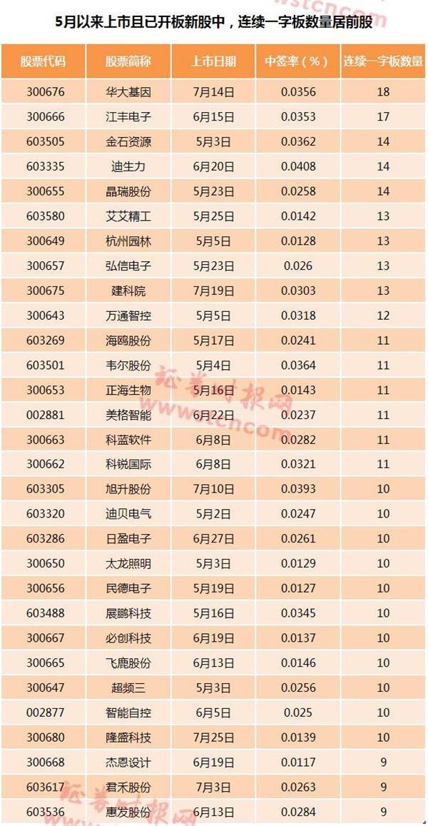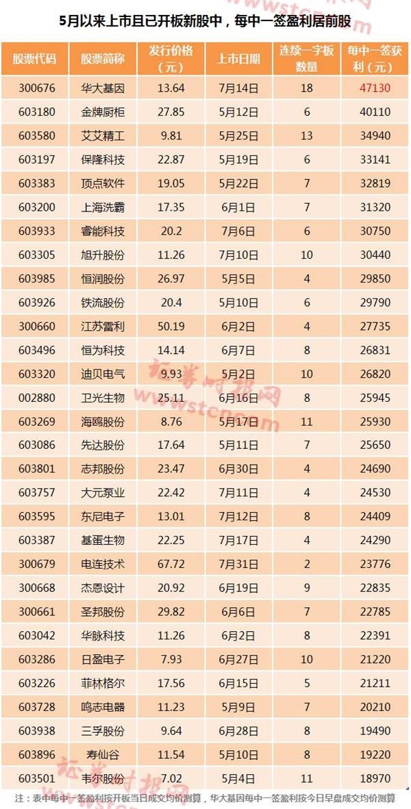 中签华大基因有如此高的收益得益于其上市后受到市场的强烈追捧。据记者统计, 5月以来上市的104只新股连续一字板平均数为7.7个,其中连续一字板数量超过10个的仅16只。华大基因上市后连续一字板数量高达18个,这一数量亦为5月以来上市新股中最高。