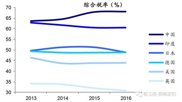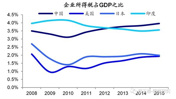 全球横向比较,中国企业税负较高。福耀玻璃董事长曹德旺称“美国企业所得税35%,加上地方税、保险费等税费,综合税费率是40%,而中国制造业的综合税负比美国高35%。”从宏观的税负率角度看,我国财政收入企业所得税占GDP的比重较高,2015年为4%,而美国为1.9%、日本为2.0、印度为3.6%,单就企业所得税一项在整个宏观经济的比重就已经较高。而中国企业承担的税负远比这个复杂,除了25%的企业所得税外,还包括增值税,消费税、城市维护建设税、教育费附加、印花税等等。此外,企业还承担了员工社保和公积金的一部分,据分析如果员工月税前工资是1万元的话,企业要额外负担五险一金4410元。综合来看,中国企业负担的税负重,根据世界银行的数据横向比较各国的综合税率,可以发现中国的综合税率确实较高,2016年的高达68%,而美国为44%,日本48.9%,英国30.9%,同样为发展中国家的印度也比中国低7.4个百分点,为60.6%。