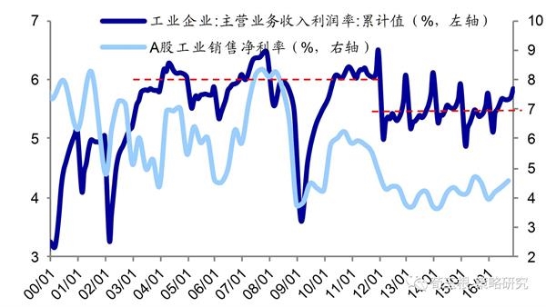产业不断更替,制造业中高毛利的子行业不断变化。现在曹德旺抱怨国内税负高,企业负担压力大,但是回头看,在80年代中后期福耀玻璃毛利率曾经高达90%左右。随着时代的变迁,技术的革新,产业周期的变化,玻璃行业高毛利的时代已经过去,现在玻璃等传统制造业盈利逐渐下滑,企业负担压力增大。在《十年一片天:产业周期跨越股市牛熊-20160225》中曾经分析,产业周期十年一个轮回。1990-2000年是消费制造时代,以消费制造业为主导。2000-2010年是工业制造时代,加入WTO以及城镇化率带来的房地产产业链的大发展使得工业制造行业迎来加速发展。2010年之后则进入了智能制造的时代,此前主流的传统制造业盈利能力出现了明显下滑,工业企业利润率从6%左右下降到了5.5%,A股工业行业的净利率从6左右下降到了4%附近,传统的制造业已经沦为低端制造业,而技术含量高的高端制造业则保持了较高的盈利水平。以上市公司为样本,可以看出制造业的轮动情况。消费制造时代的代表家电行业在90年代ROE和毛利率均保持较高水平,最高分别为27.4%和28.5%,01-05年ROE跌至0附近,毛利率最低也下滑至15%。而工业制造时代的代表工程机械行业,其ROE和毛利率水平从02年开始震荡上行,一直到11年底见顶开始下滑。代表智能制造的通信设备制造业,ROE和毛利率均保持了一个很好的回升态势,目前ROE为8.2%,毛利率为21.4%。综上可以看出,产业周期性变化的过程中,旧的产业盈利能力逐渐下降,而新的产业则会有高的盈利水平。