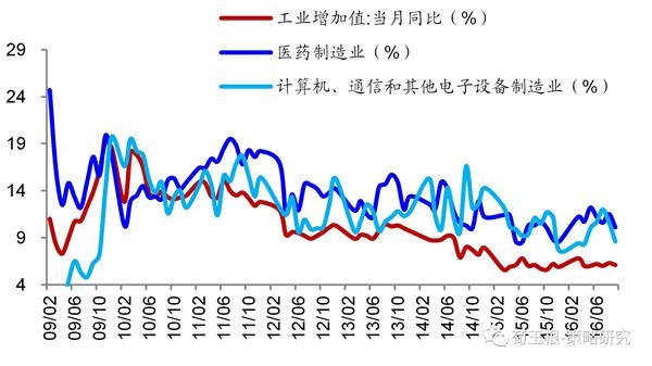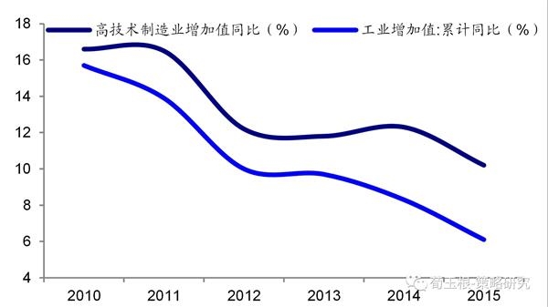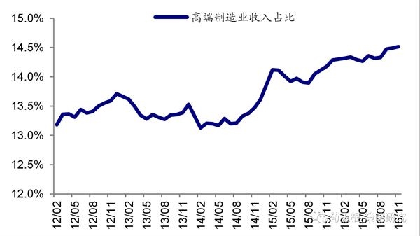 转型的希望:高端制造业保持高增长,占比逐渐增大。对于制造业整体而言,10年开始盈利水平持续下滑,而对于处于当今时代的高端制造业而言,盈利水平早已企稳。10年至今工业增加值同比从18.1%下降至6.2%,但计算机、通信和电子设备业工业增加值从10年3月的高点19.5%降至12年6月份最低点9.6%后企稳,12年以来平均增速维持在11%左右。医药制造业工业增加值从11年7月高点的19.5%降至14年8月的10.6%后企稳,14年8月以来平均增速为10.6%。统计局《国民经济和社会发展统计公报》中将医药制造业,航空、航天器及设备制造业,电子及通信设备制造业,计算机及办公设备制造业,医疗仪器设备及仪器仪表制造业,信息化学品制造业合称为高技术制造业,近年来其增加值增速显著快于工业整体,15年高技术制造业增加值增长10.2%,占规模以上工业增加值的比重为11.8%。相似地,我们将医药制造业,铁路、船舶、航空航天和其他运输设备制造业,计算机、通信和其他电子设备制造业,仪器仪表制造业视为高端制造业,其工业企业营业收入占全部制造业之比逐年增大,从12年2月的13.2%增至16年11月的14.5%。高端制造业是我国重点发展的领域,此前发布的《中国制造2025》是我国制造强国战略的行动纲领,近期,16年12月7日工信部发布智能制造“十三五”规划,12月19日国务院公开发布《“十三五”国家战略性新兴产业发展规划》。《战略新兴产业发展规划》中提到的重点发展产业有信息技术产业,高端装备与新材料产业,生物产业,新能源汽车、新能源和节能环保产业,数字创意产业五大产业,其中大部分均与高端制造有关,可见国家对高端制造业的重视程度之高,未来要继续发展高端制造业,逐渐提高其在行业中的占比。