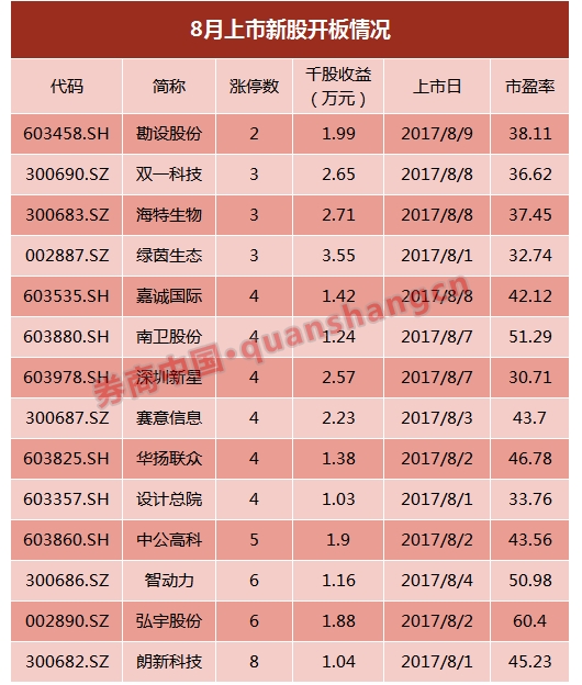 仅8月上市的公司中,就有4只个股的连板数量不超过3个。具体而言,双一科技海特生物绿茵生态只获得3个涨停,每千股收益分别为2.65万元、2.71万元和3.55万元,勘设股份只有2个涨停,每千股收益为1.99万元。