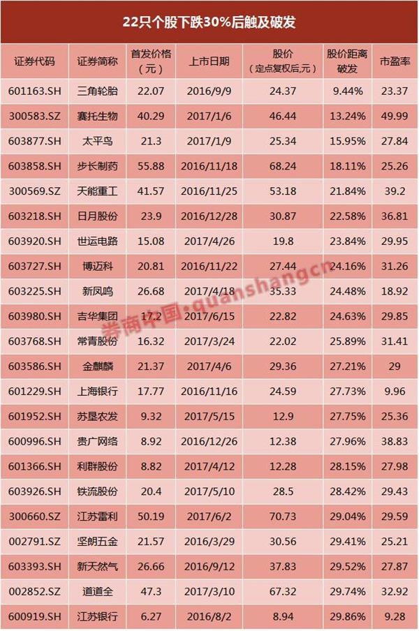 一度还很遥远的新股破发也开始向市场走来。数据显示,在2016年后上市的个股中,已经有22只个股距离发行价只有不足30%距离,三角轮胎赛托生物太平鸟步长制药等4只个股距离发行价不足20%距离,值得关注的是,三角轮胎股价如再下跌9.44%便会触及“破发”。