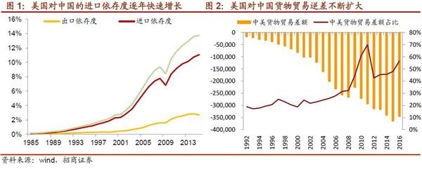 中美贸易关系紧密,中国对美国出口占美国进口比重不断上升,中国对美国的贸易顺差占美国贸易总逆差接近一半。美国对中国外贸依存度不断上升,2015年虽有所下滑,但依然维持在高位,且对中国进口的依存度上升速度明显快于出口;同样,中国对美国的贸易顺差在美国货物贸易差额中占比快速上升,2016年这一比例高达56%,美国对中国长期存在高贸易逆差问题,这也是特普朗在贸易问题上屡屡针对中国的原因。