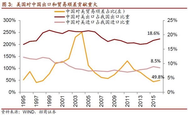 美国仍然是中国第一大贸易伙伴。2016年中国对美出口占我国总出口额、总进口额的18.6%、8.5%,仍是我国第一大贸易伙伴,对美贸易顺差在我国货物贸易顺差中的占比为49.8%,美国仍然是中国的第一大贸易伙伴,中美关系对于经济仍然十分重要。